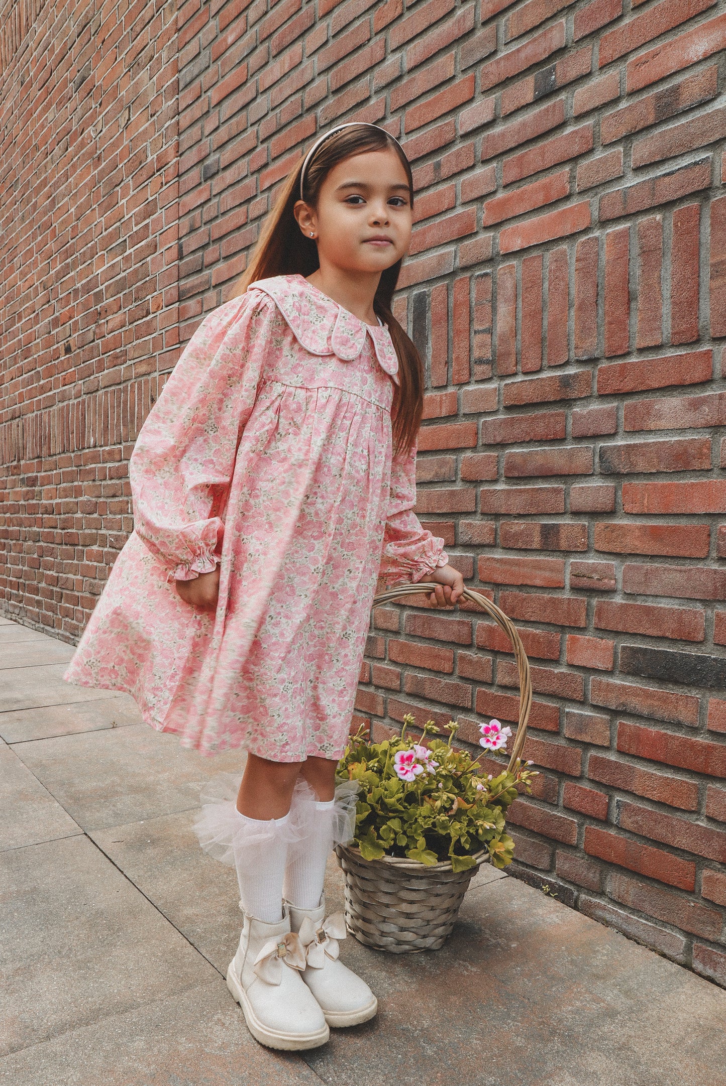 Rose dress has a sweet pink floral print with sage green leaves combination. It has a wide unique collar and button fastenings at the back. The wrists have elastic bands so you can adjust the sleeve length based on how you want it.