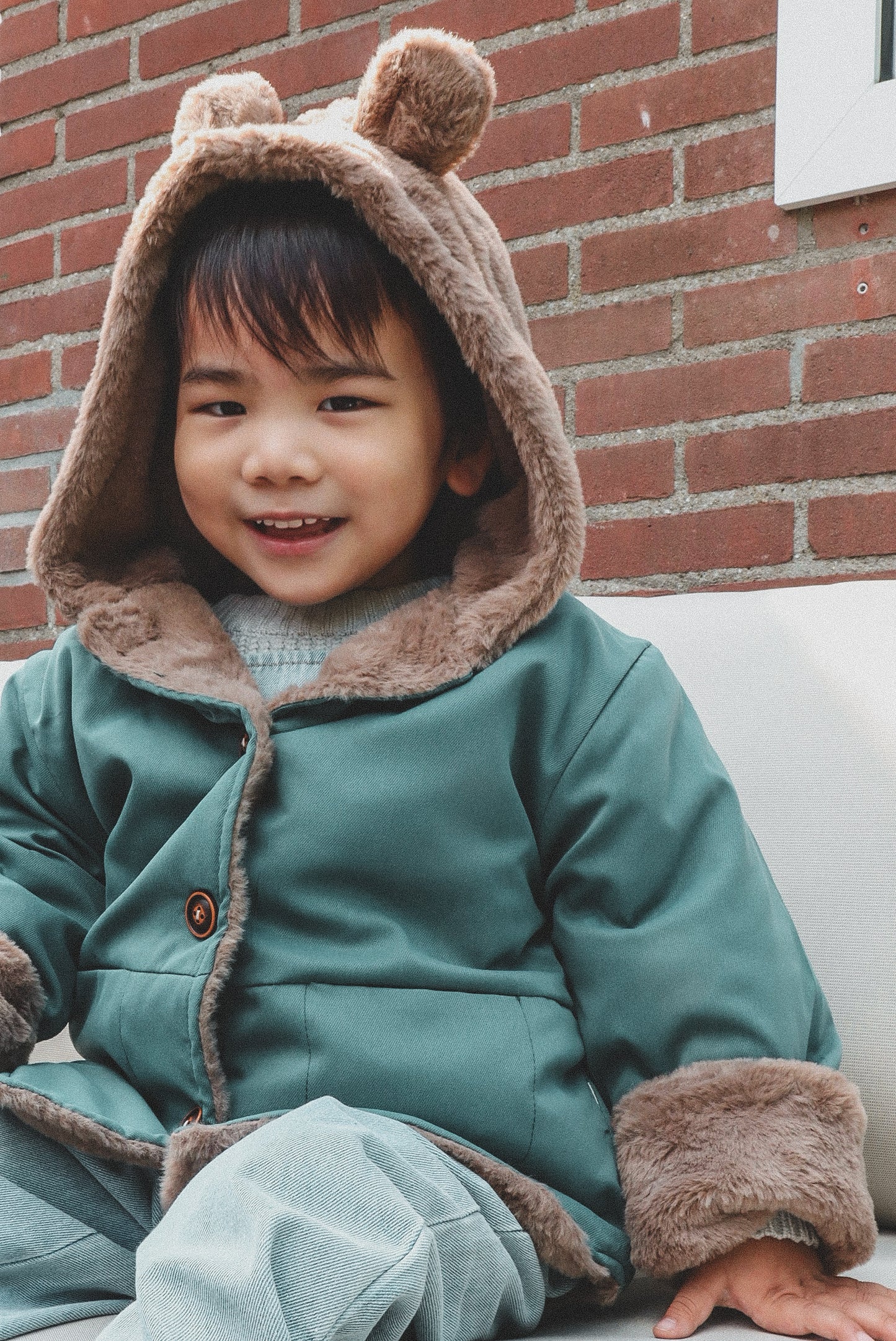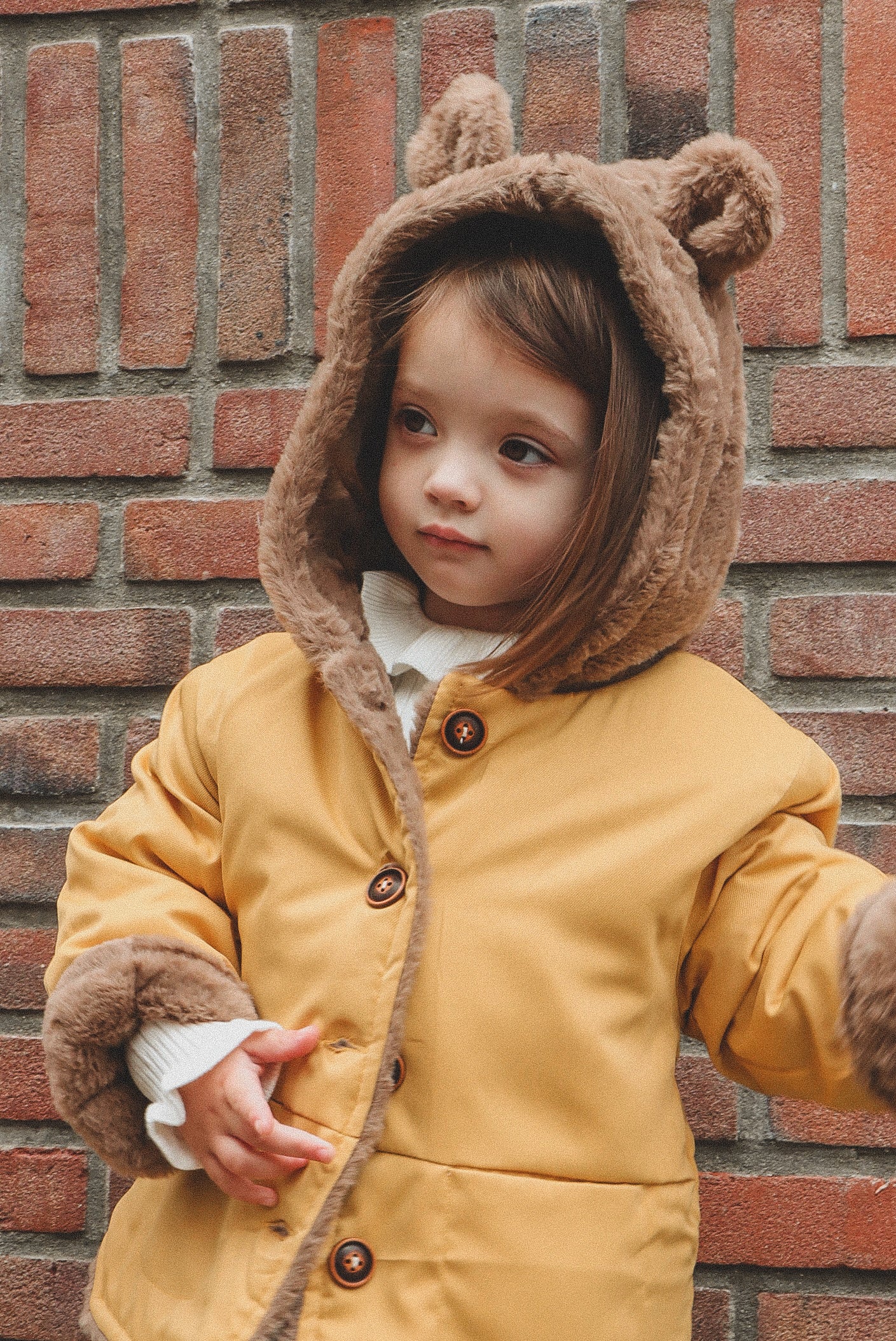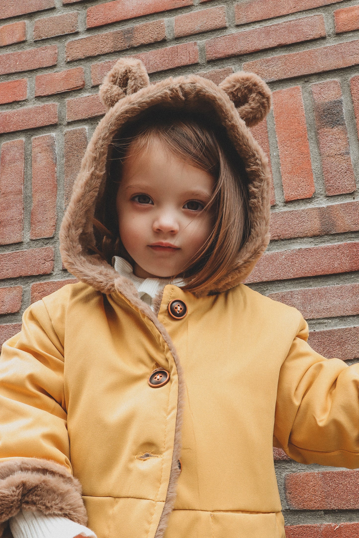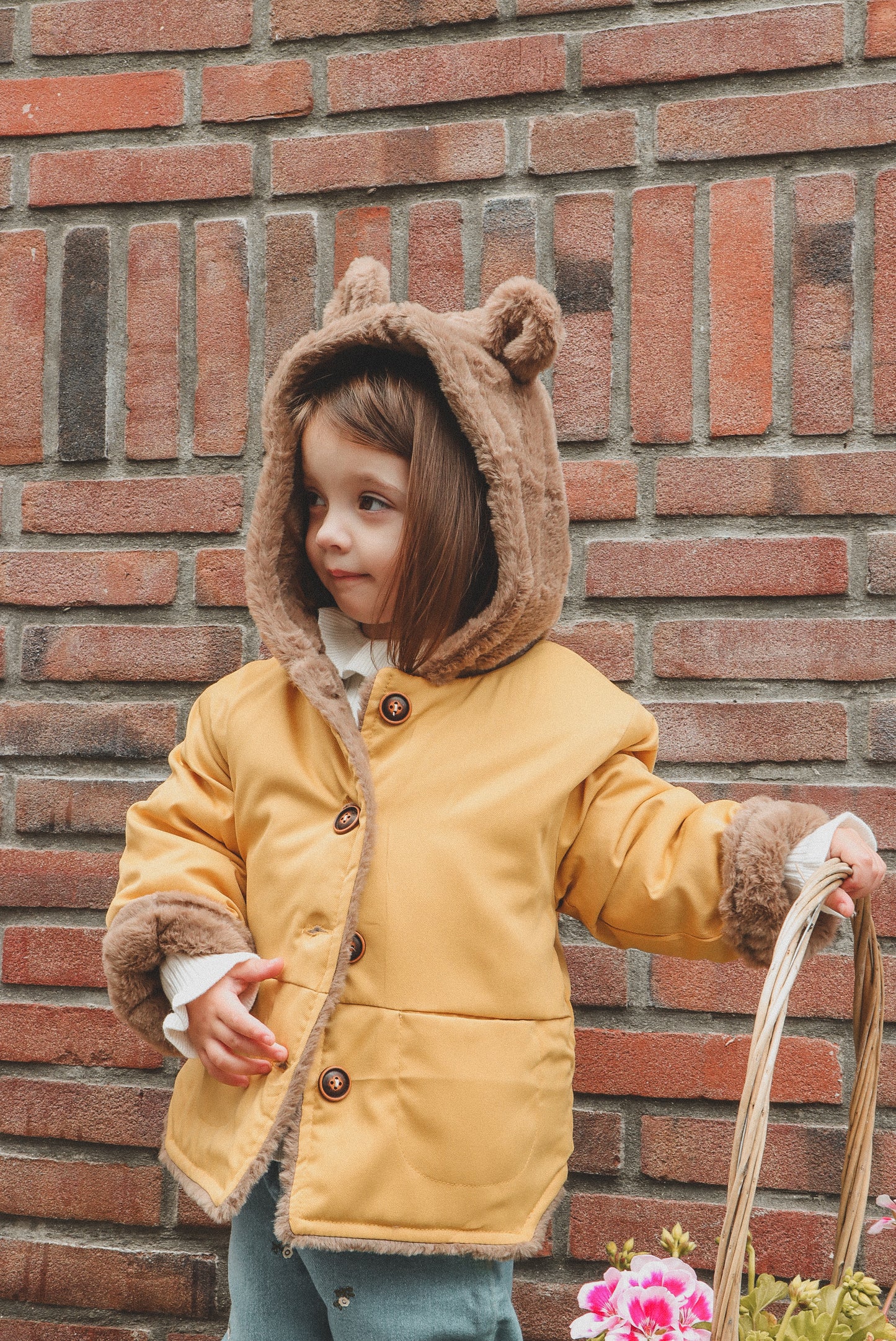 Poe jacket is a hooded bear jacket with fully fur lining to give extra warmth to the children in the Winter. It has two pockets and button fastenings at the front. It comes in 3 distinct colours; Beige, Green and Yellow.
