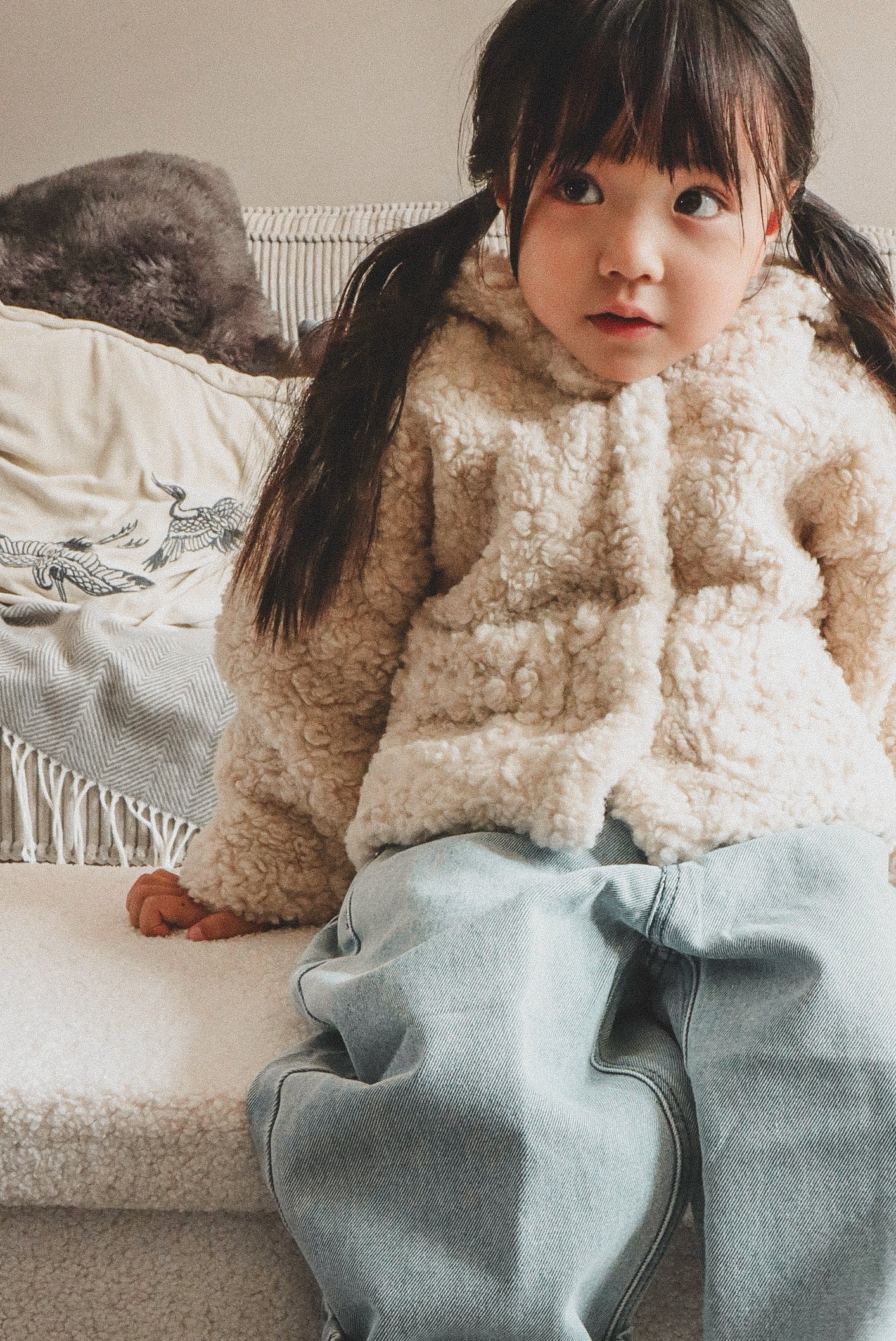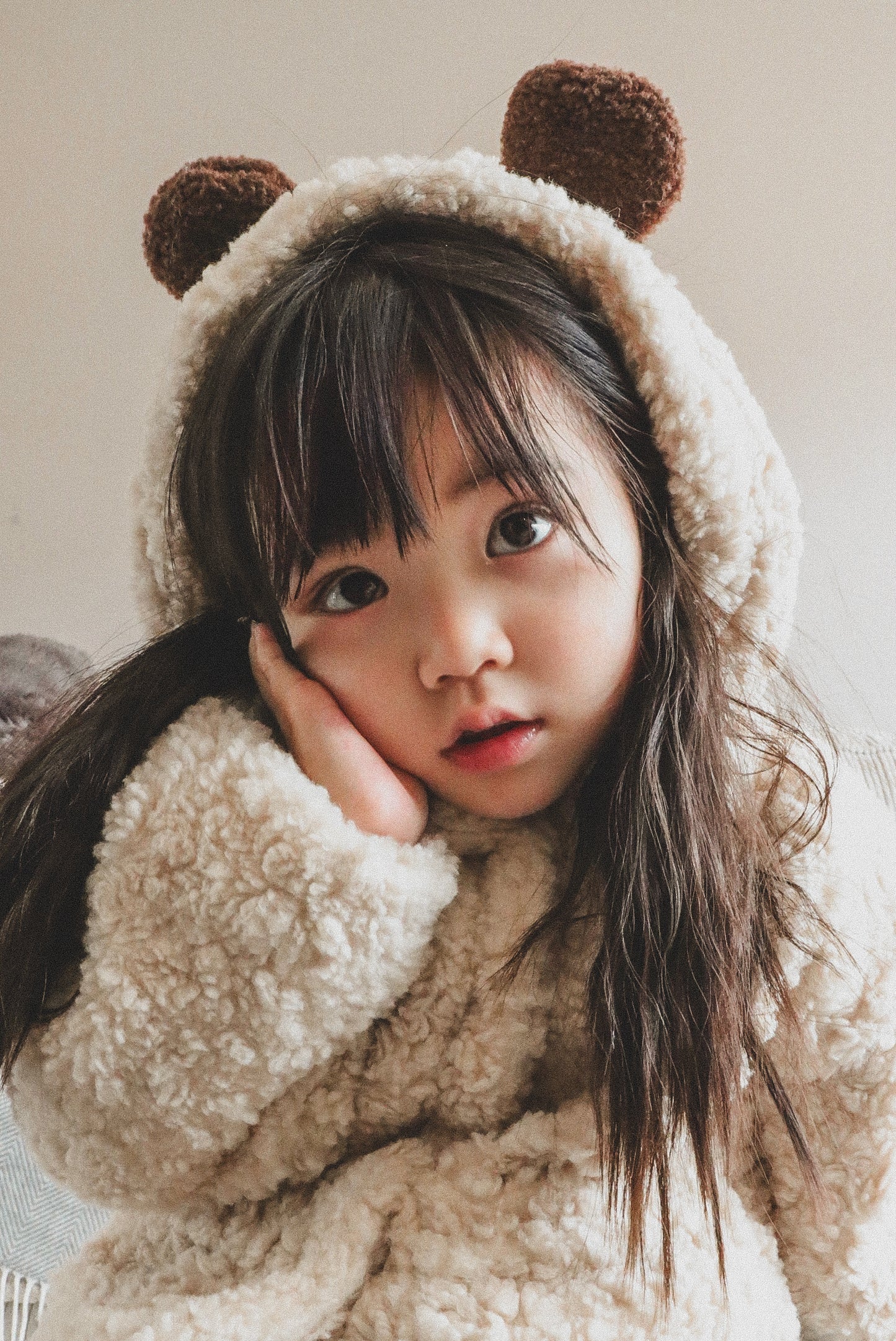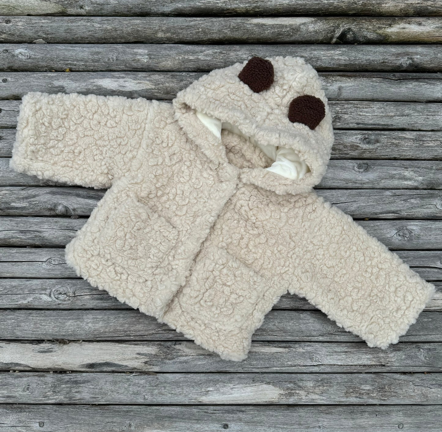 This fluffy bear jacket is a must have this season! It has a neutral Beige colour with dark brown bear ears on the hoodie, which makes it extra cute. It features two pockets and snap fastenings at the front.