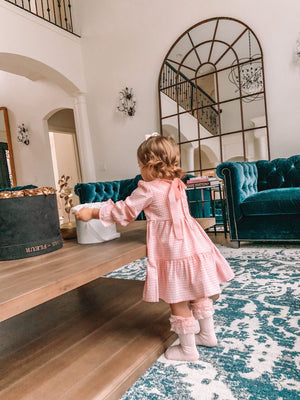 Jolene Dress heeft een perfecte combinatie tussen het blush suède lint aan de achterkant en het wit-perzik geruit patroon. Het geeft een lieve, vrouwelijke maar toch een super stoere en stijlvolle overall look!