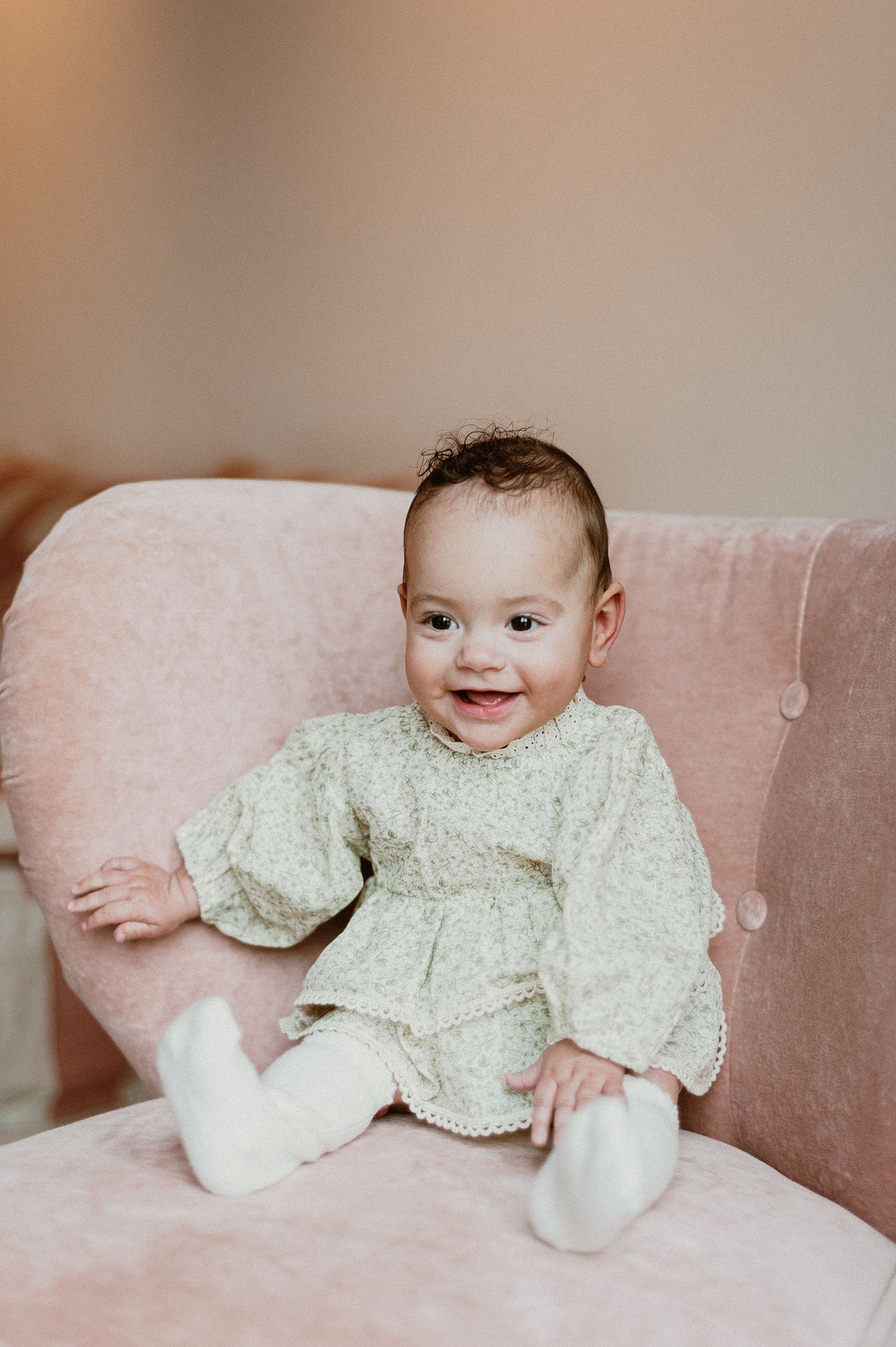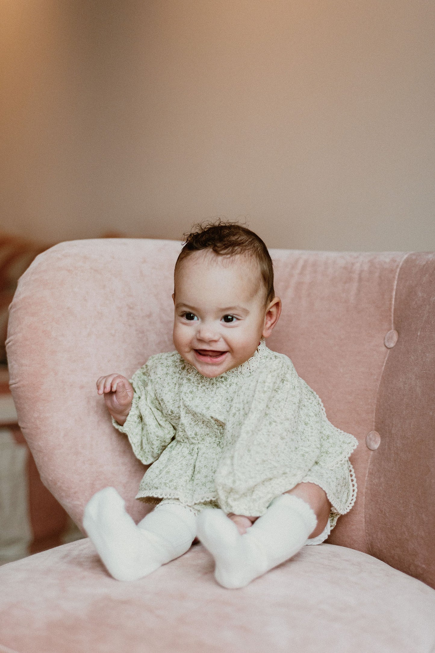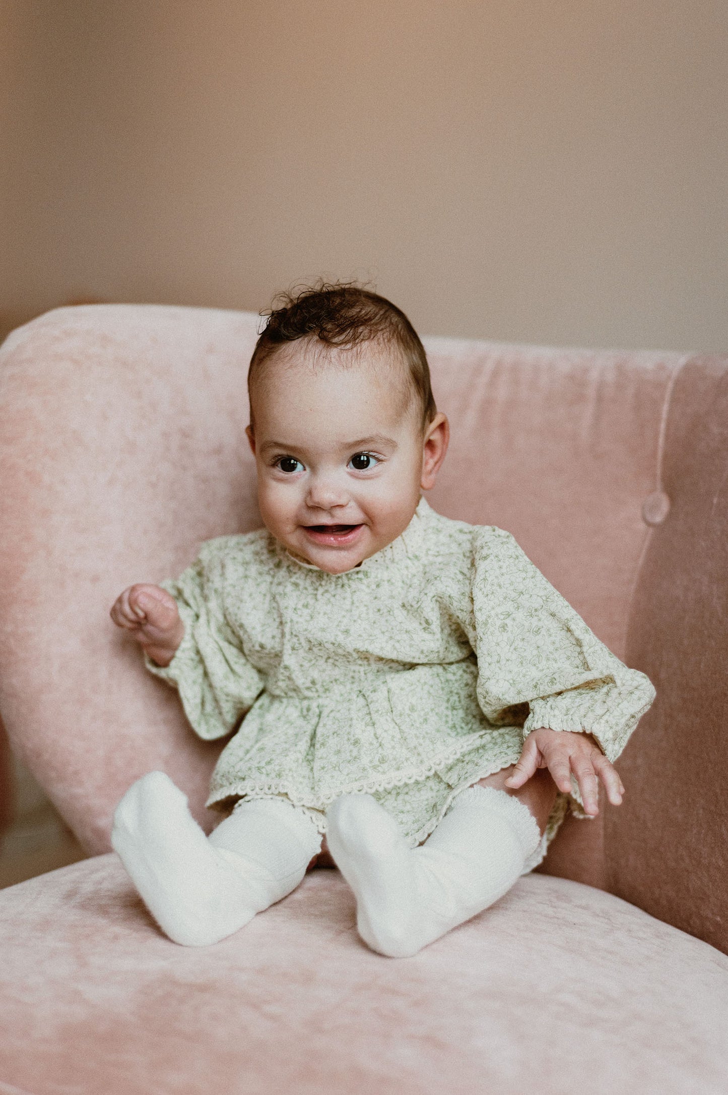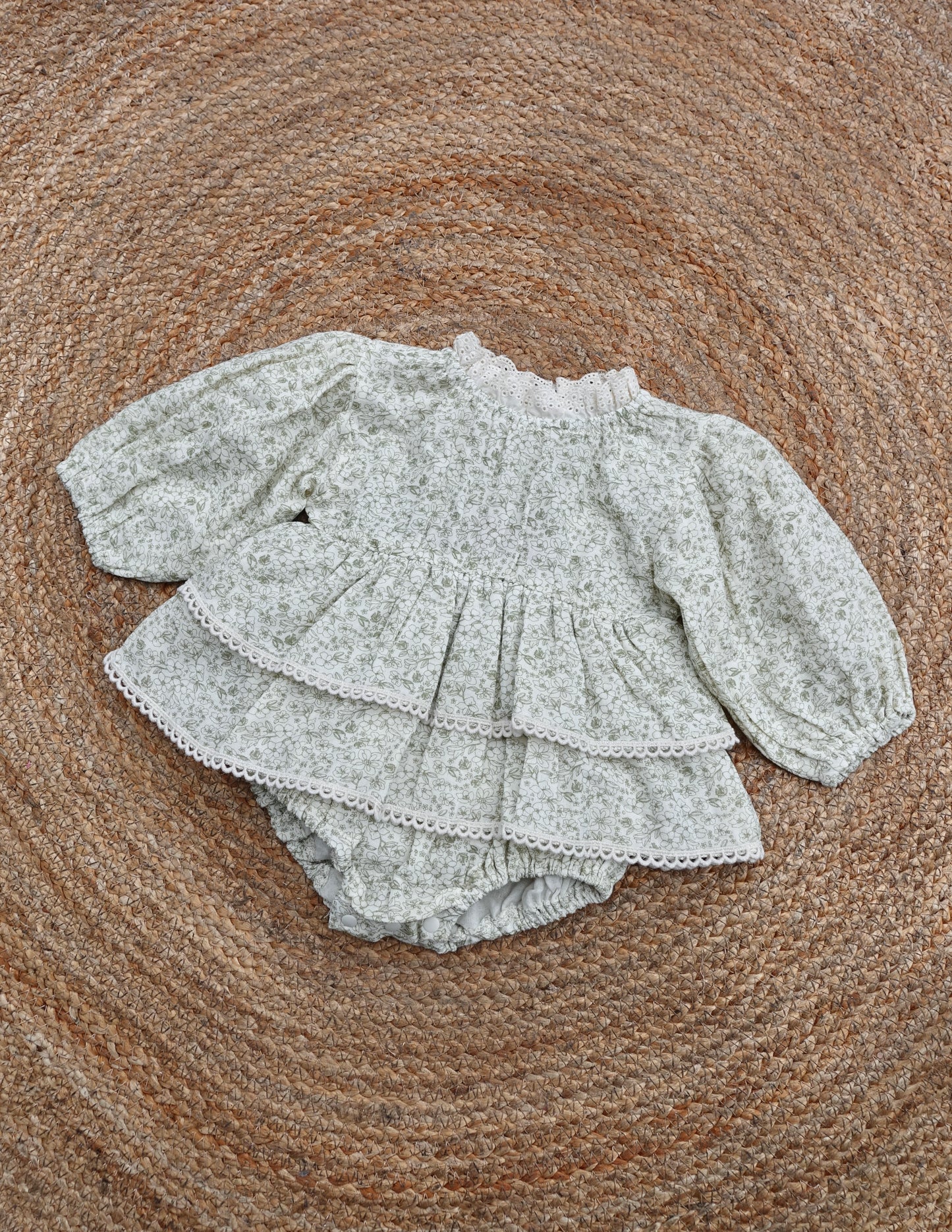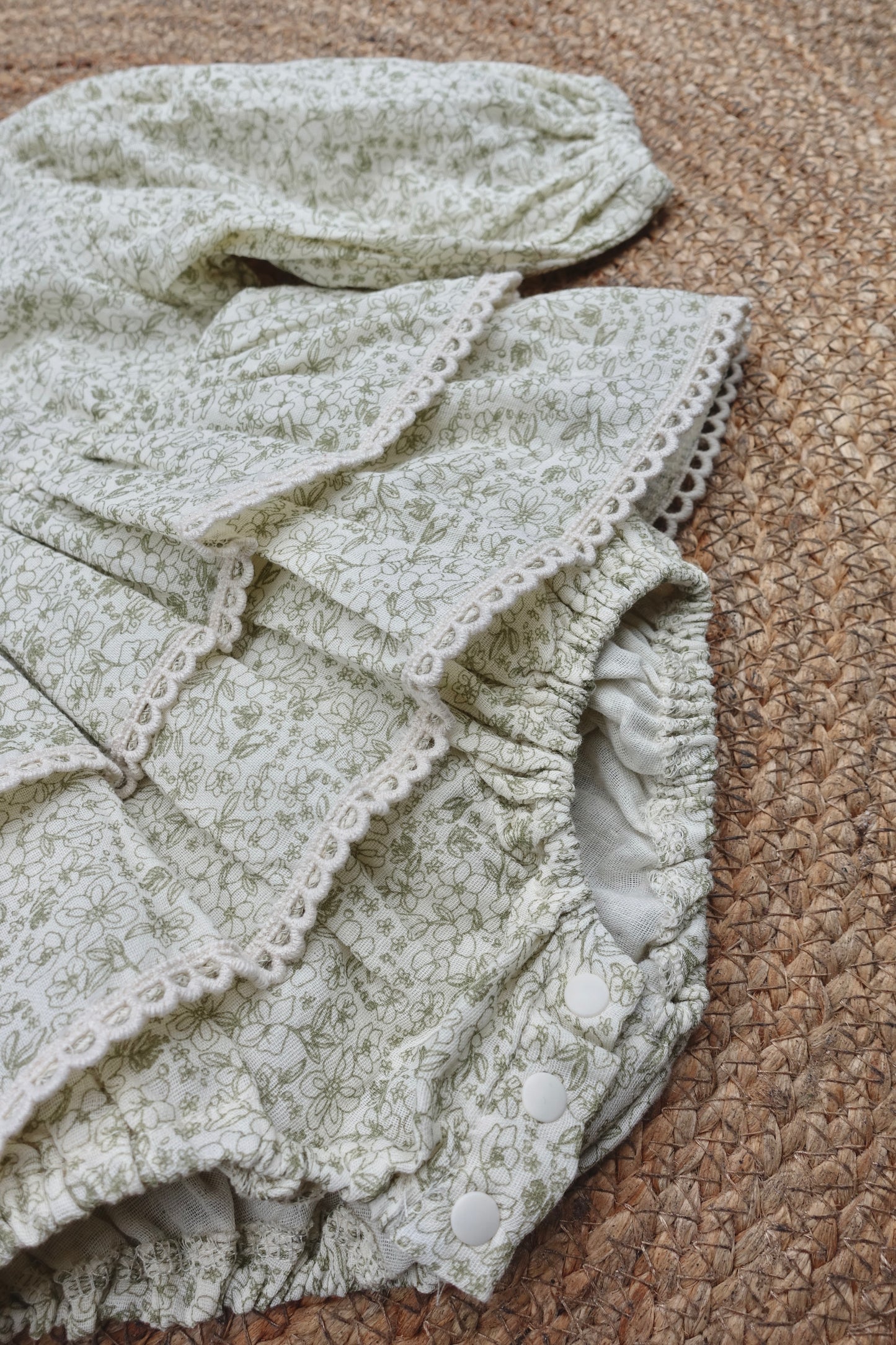 Renee is a long sleeve romper with double layered skirts. It has green floral pattern combined with a touch of lace trimming and detailing on its collar. It has snap fastenings at the bottom and elastic bands around its neckline, waist, wrists and bottoms.