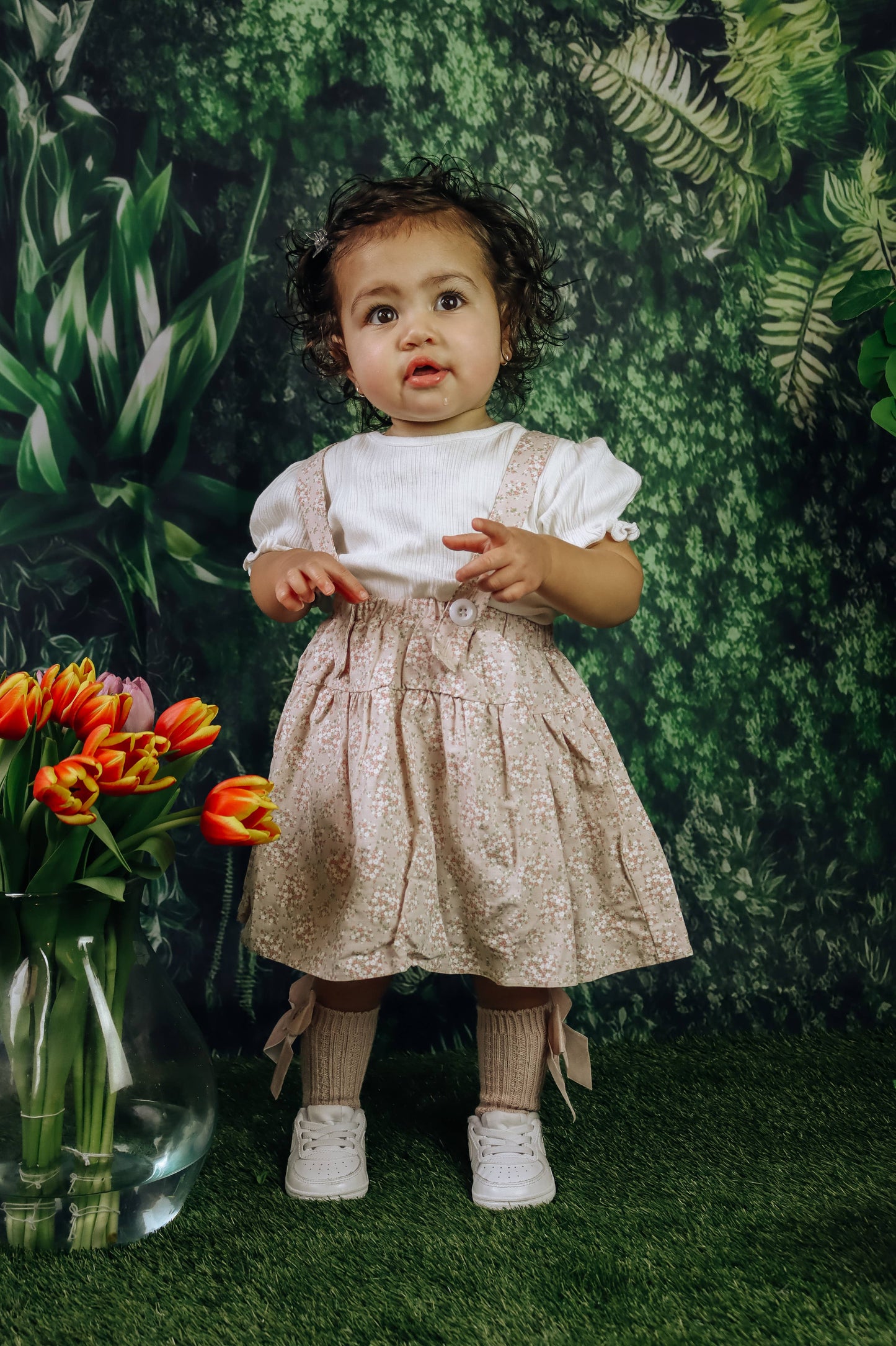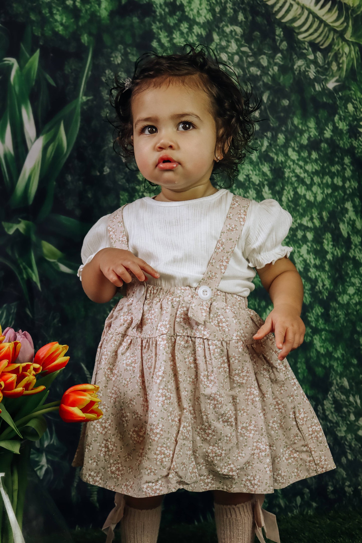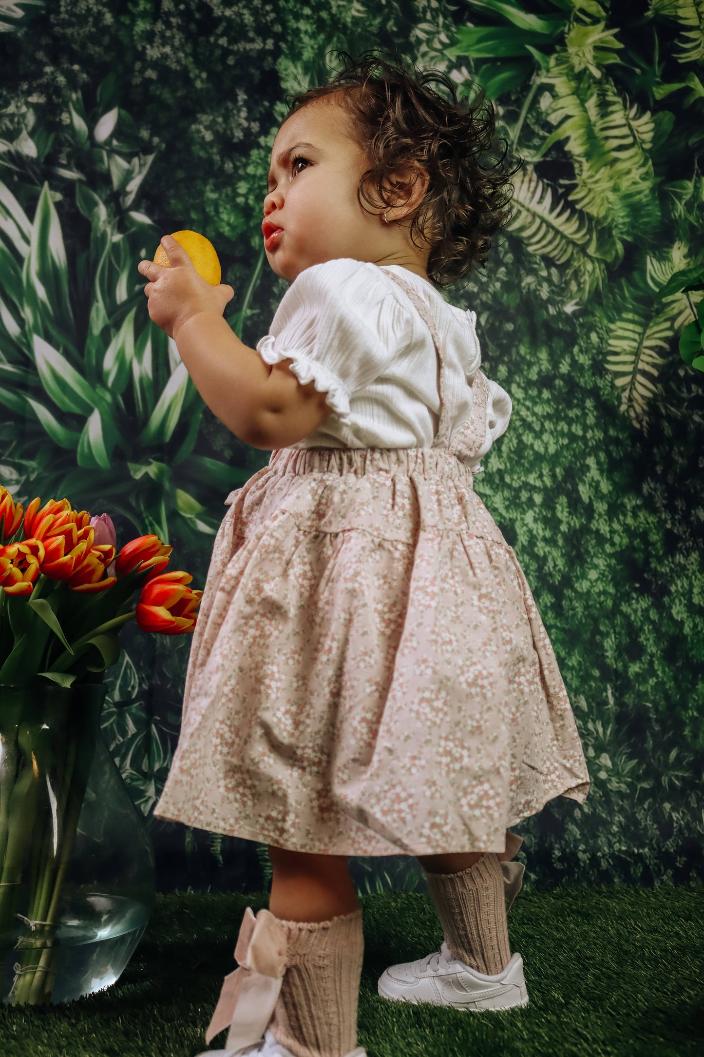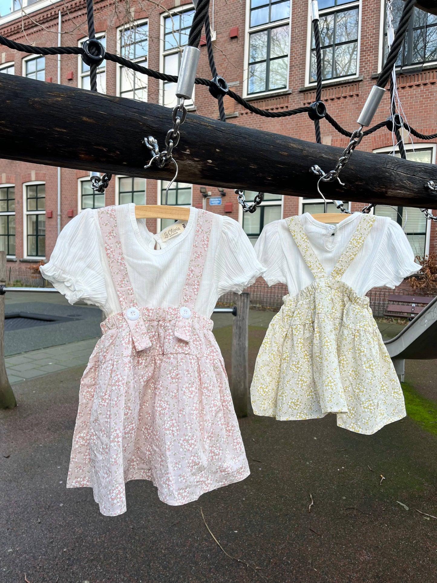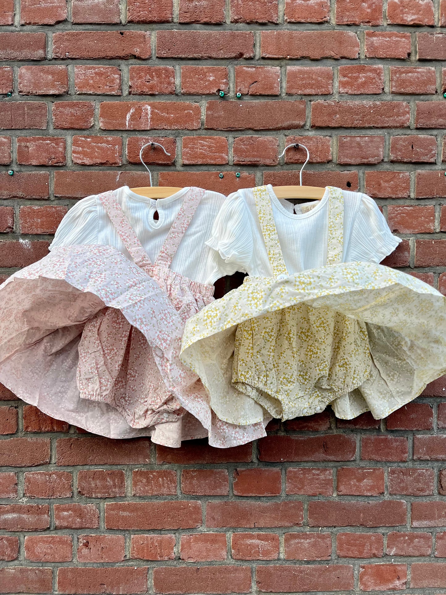 Gwen set comes in 2 pieces. A white blouse with elastic puffy short sleeves and a romper pinafore that looks like a skirt! The romper pinafore has 2 colours; pink and yellow floral pattern. The front straps are adjustable with button fastenings where you can make it longer or shorter. The inner pants of the skirt also have snap fastenings.